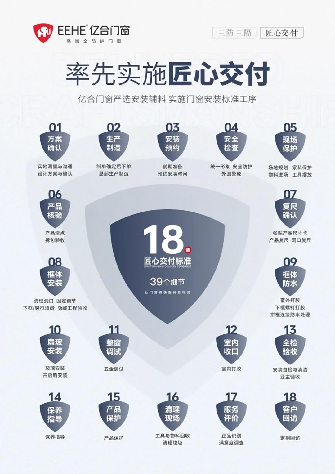億合門窗率先實施“匠心交付”服務體系,制定18道交付標準、39個質量細節規范,覆蓋測量設計、現場安裝、密封處理、驗收保養等各個環節,確保每一扇門窗的安裝都精準到位、穩固可靠。為保障門窗與墻體間的密封性與牢固性,“匠心交付”規范使用專業施工輔料,遵循標準化施工步驟,通過膨脹螺栓、歐式自切螺釘等配件的專業安裝,讓門窗與墻體緊密貼合,進一步強化密封與穩固效果,實現最佳的全防護功能。