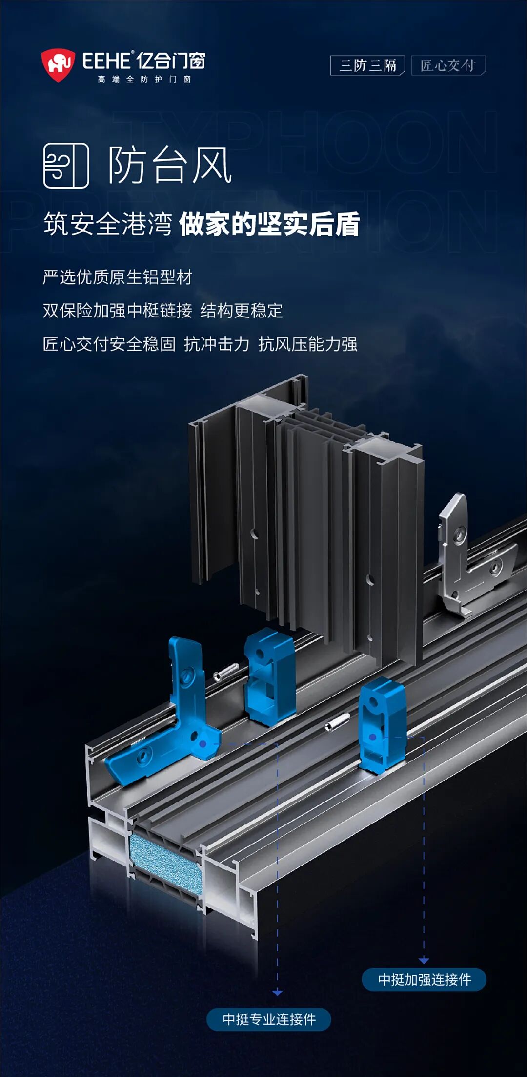 同時,門窗型材的平整度與穩固性,也會直接影響密封效果,一旦型材變形,漏風問題便會隨之而來。億合門窗選用航空級原生鋁型材,搭配加強中梃設計,讓窗體具備出色的抗變形、抗風壓能力,從結構上杜絕冷風滲入的可能。對于高層住宅而言,這不僅能防止門窗在大風天氣出現晃動、漏風的情況,還能降低風嘯帶來的噪音干擾,讓室內始終保持安靜與溫暖。