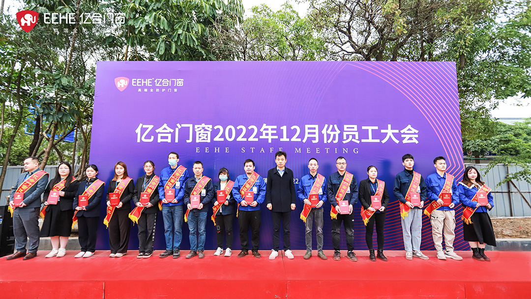 冬程可期,加勁沖刺。12月5日上午,億合門窗12月份全體員工大會在公司新擴建的生產基地隆重召開,正式吹響了2022年度收官之戰的沖鋒號角。億合門窗總經理胡超攜全體員工1500余人共同出席大會。